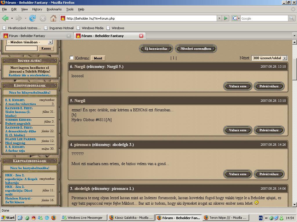 | Új/módosult hírelemek |  | Orgling lázadás |  | E-mail címek a listához |  | Nosztalgikus legek, avagy legnagyobb szívások. |  | Szabályok kidolgozására  tett ötletek. |  | ŐV újra élesztése |  | Keresem a régi cimbiket!!! |  | Patch |  | újítás |  | Leállás |  | ROFL |  | mi lesz ebbol? |  | Kész a 20 szint ! |  | Változások 2008,11,10 |  | Jubileumi Fantasy Találkozó avagy oooolimpia lesz |  | Búcsúdal (?) |  | Patch a tali után |  | Pénteki táplálás |  | Peccs |  | Ujabb adag gyogyszer a komas betegnek |  | Új fejlesztés került be a játekba! |  | Folyt. kov. |  | 9 = 1 :)) |  | ŐV JV szabadság |  | Nincs tobbe postara jaras ! :) |  | Holnapi peccs |  | Pénteki javítás (a Beholder honlapjáról) |  | Peccs |  | ÚJ KLÁNKÉPESSÉGEK |  | Haladás |  | Olimpia lesz (jelentkezés november 19.-ig) |  | Fejlesztések ezerrel |  | Ünnepi munkarend |  | 2007. 10. 04-ei patch |  | Elkészült a 18. szint |  | Friss Hir! |  | Ősök városa (és TF) kedvezmények,uj karakter indításakor....(hehe) |  | Végre! Amit mindenki régóta várt! Nagy horderejű fejlesztések a Beholdernél |  | Új időszámítás - BMT |  | Peccs peccs hátán |  | Az Uralkodó örökre elkárhozott!! |  | Hamis arany |  | Peccs |  | Állás |  | krónika |  | megujabb peccs |  | uj peccs |  | Tisztelt Tihor Miklos! |  | ÖV találkozó programja |  | Jelmezverseny |  | toborzó!? |  | Leanthil megtér |  | Olimpia/Tali |  | Szerver leállás |  | Őv-Tf-Hkk találkozó |  | I.Felszín-visszafoglaló gyalogtúra |  | hibajavítás |  | Valek: van új patch!!! |  | Új avatárok |  | Febr. 5-ei peccccccs. |  | Teleportálás |  | Patch javitas! |  | Admin pályázat |  | Új patch |  | karácsonyi patch |  | IRC Fórum januárban |  | Munkarend a két ünnep között |  | 2007-es kuponok kronikaban |  | ŐV-s cikkek |  | peccs: 2006.12.1. |  | Ifjú titánok |  | Új patch 2006.11.20. |  | szabi |  | Változások |  | Alanori Krónika |  | AK cikkíró |  | Új Csoport(ok)! |  | Ma nem lesz kiküldés! október 2. |  | Költözik a cégünk! |  | PECCS |  | Alanori Krónika 2006.szeptember - Ősök Városa Kulisszatitkok |  | Peccs (2006 szeptember 4.) |  | Pályázat |  | 2006.8.11.Peccs |  | Új fejlesztés - Kaszinó |  | Áremelés! |  | Peccs (VII. 31.) |  | július 17. P. |  | 2006.7.10. PECS |  | szabi behonal |  | OLIMPIA |  | kalandtervezo palyazat |  | specializáció |  | Uj patch!! |  | Új IRC statisztika |  | Specializáció: tervezet |  | Beholder szerver leállás |  | PECS |  | Kisebb új funkció készült Baltaroghoz |  | Specializáció |  | pecs (06.04.13.) |  | Csütörtöki leállás! |  | Új peccs Behonal |  | Letöltés változás |  | Lehellet |  | beho listan jott |  | Uj peccs(ek) |  | Hősök kerestetnek |  | Címlapon a behó! |  | Új apróbb peccs - feb. 14. |  | plusz+ |  | Mai patch |  | Uj spellekrol... (c) Beholder - AK |  | Ujabb korlat |  | Új patch |  | Ünnepi nyitvatartás |  | Felhívás - Nagy év végi aura gyűjtő akció!!! |  | PEEEECCCCSSS  - Dec 13. - |  | Pénteki BUG |  | UJRATAPLALAS PENTEK DELELOTTI FORCSIRA |  | Behos hir |  | KALANDOR RANGOK |  | nov. 28-ai PATCH |  | ŐV-s varázslattervező pályázat |  | nov. 10-i PATCH |  | új peccs |  | Szün- és Ünnepnapok |  | Olimpia |  | Új patch |  | döglődő datatrans |  | Uj patch |  | A Legendák Völgye |  | 2005. augusztus 24-i PATCH |  | Hamarosan!!! |  | 2005. július 21. |  | Ha még valaki nem látta volna... |  | Vadi új patch (2005.06.23.) |  | Újabb patch (május 4.) |  | Molesztált egy bárd |  | Új patch (április 29.) |  | Torzak besorolása |  | Véget ért a Bárdverseny! |  | Szerintem... |  | Üdvöz légy a Teron Népén! |  | 143 darab |  |   |  | Hírek új hozzászólással |  | ROFL |  | ŐV újra élesztése |  | Orgling lázadás |  | E-mail címek a listához |  | Nosztalgikus legek, avagy legnagyobb szívások. |  | Szabályok kidolgozására  tett ötletek. |  | Patch |  | újítás |  | Leállás |  | mi lesz ebbol? |  | Kész a 20 szint ! |  | Változások 2008,11,10 |  | Jubileumi Fantasy Találkozó avagy oooolimpia lesz |  | Búcsúdal (?) |  | Patch a tali után |  | Pénteki táplálás |  | Peccs |  | Ujabb adag gyogyszer a komas betegnek |  | Új fejlesztés került be a játekba! |  | Folyt. kov. |  | 9 = 1 :)) |  | Nincs tobbe postara jaras ! :) |  | ŐV JV szabadság |  | Holnapi peccs |  | Pénteki javítás (a Beholder honlapjáról) |  | Fejlesztések ezerrel |  | Haladás |  | Peccs |  | ÚJ KLÁNKÉPESSÉGEK |  | Olimpia lesz (jelentkezés november 19.-ig) |  | Ünnepi munkarend |  | 2007. 10. 04-ei patch |  | Elkészült a 18. szint |  | Friss Hir! |  | Ősök városa (és TF) kedvezmények,uj karakter indításakor....(hehe) |  | Végre! Amit mindenki régóta várt! Nagy horderejű fejlesztések a Beholdernél |  | Új időszámítás - BMT |  | Peccs peccs hátán |  | Az Uralkodó örökre elkárhozott!! |  | Hamis arany |  | Peccs |  | Állás |  | krónika |  | megujabb peccs |  | uj peccs |  | Tisztelt Tihor Miklos! |  | ÖV találkozó programja |  | Leanthil megtér |  | Jelmezverseny |  | toborzó!? |  | Olimpia/Tali |  | Őv-Tf-Hkk találkozó |  | Szerver leállás |  | I.Felszín-visszafoglaló gyalogtúra |  | hibajavítás |  | Valek: van új patch!!! |  | Új avatárok |  | Febr. 5-ei peccccccs. |  | Teleportálás |  | Admin pályázat |  | Új patch |  | karácsonyi patch |  | ŐV-s cikkek |  | IRC Fórum januárban |  | Munkarend a két ünnep között |  | 2007-es kuponok kronikaban |  | peccs: 2006.12.1. |  | Új patch 2006.11.20. |  | Változások |  | specializáció |  | szabi |  | Alanori Krónika |  | AK cikkíró |  | Új Csoport(ok)! |  | Ma nem lesz kiküldés! október 2. |  | Költözik a cégünk! |  | PECCS |  | Alanori Krónika 2006.szeptember - Ősök Városa Kulisszatitkok |  | Peccs (2006 szeptember 4.) |  | Pályázat |  | 2006.8.11.Peccs |  | Áremelés! |  | Új fejleszté